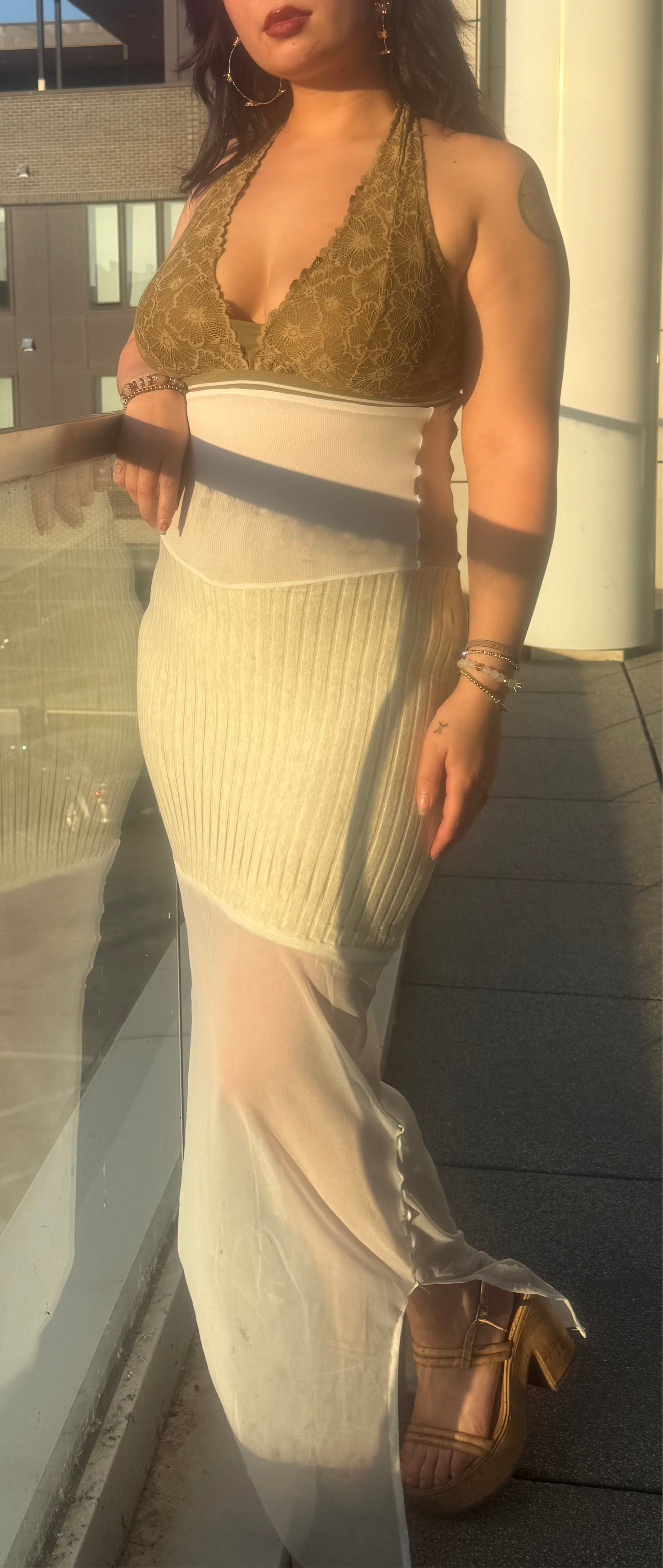 Make a statement with our "Lavish & Lacey" maxi dress. This dress features a stunning combination of olive green and ivory white, with added white mesh cut outs at the stomach and bottom. Elevate your style and flaunt your confidence in this bold and unique dress.